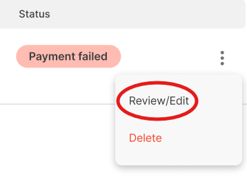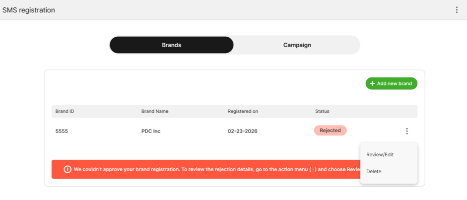 If your Brand is rejected, you can edit and resubmit. Navigate to the overflow menu on the right of your brand. Select “Review/Edit.”