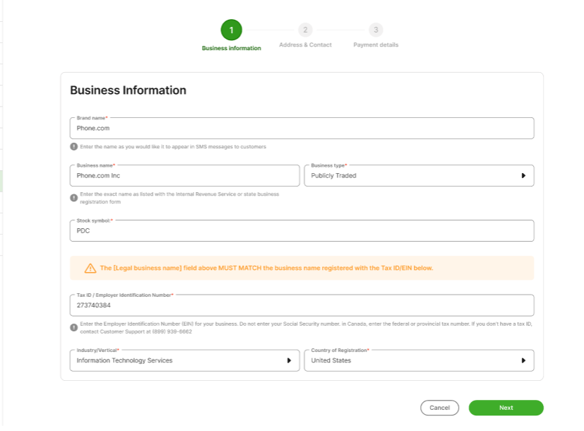Vertical: Select the industry vertical that best matches your business type. It should align with what you submitted to the IRS or Canadian government when you received your EIN or Canadian Business Number.