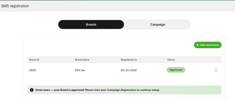 If your Brand status is "Approved," you can move on to Campaign registration. Campaign registration is necessary even for conversational text messaging. You will not be able to register for a campaign until your Brand is approved.