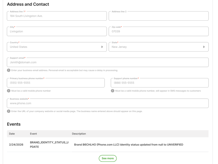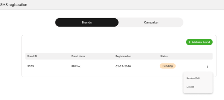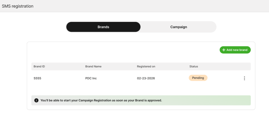After submitting your Brand, the status will appear as Pending during review. Status updates are expected to be completed within approximately 30 minutes.