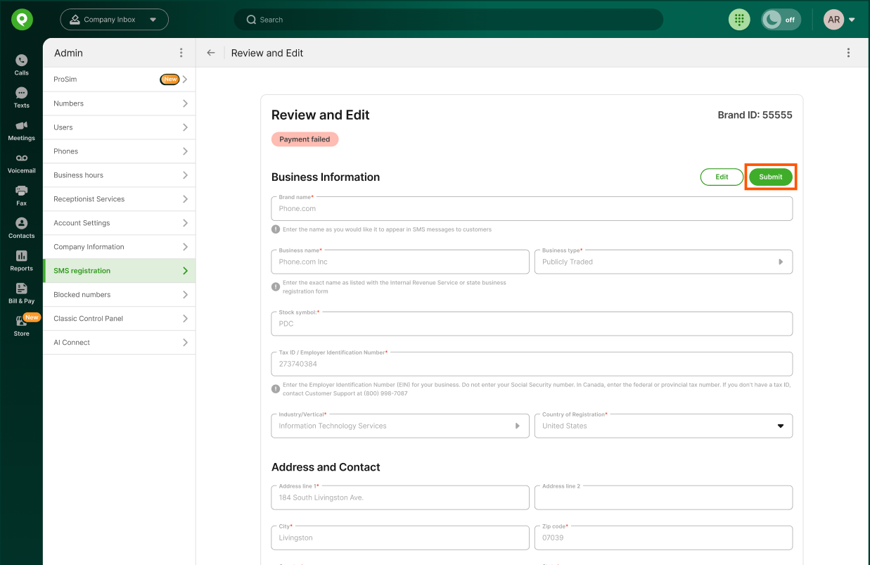 Return to the SMS registration, select Review/Edit page and submit your Brand registration again.