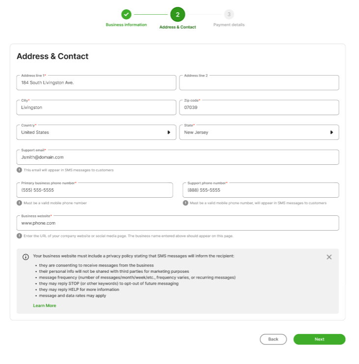 - A Terms and Conditions page that includes Messaging Terms and Conditions. For example, "You agree to receive informational messages (appointment reminders, account notifications, etc.) from [Company Name]. Message frequency varies. Message and data rates may apply. For help, reply HELP or email us at [email address]. You can opt out at any time by replying STOP."