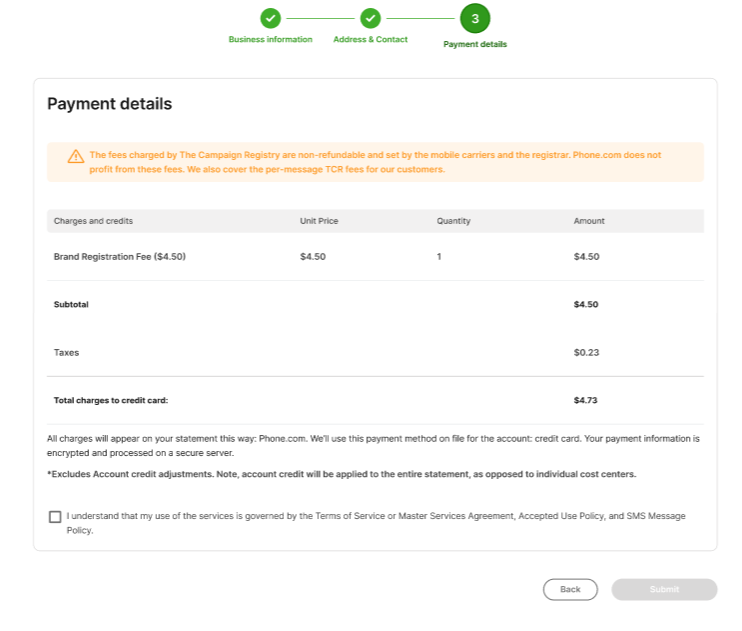Once you have completed the business information, you can review the registration fee and accept the terms. Then click “Submit.”