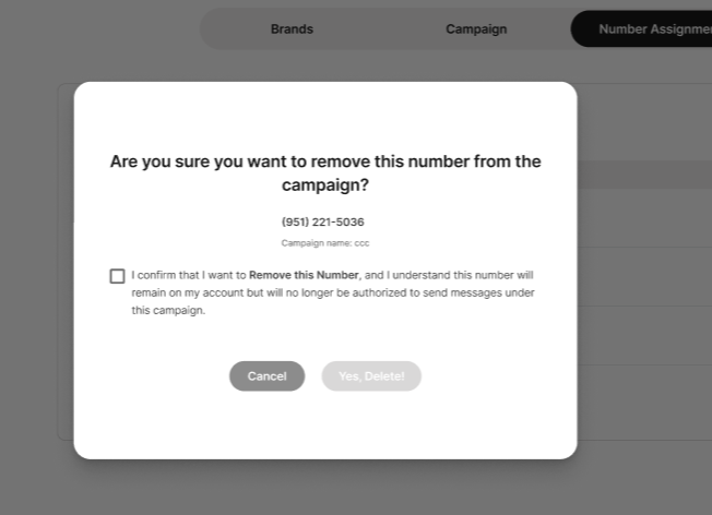 Confirm that you understand that removing the number from the Campaign will not remove the number from your account but it will no longer be authorized to send messages.