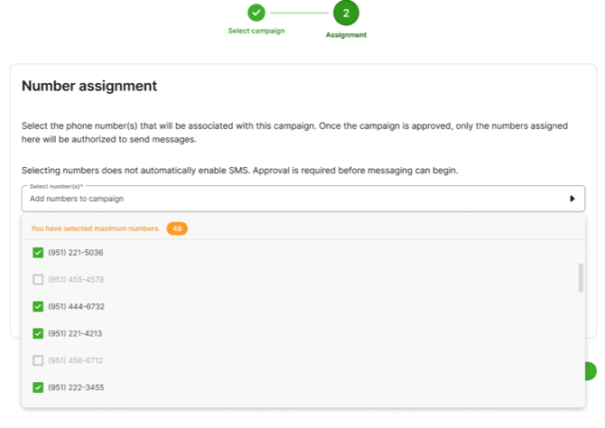 Select which numbers you would like assigned to the Campaign. You can connect up to 49 numbers with each Campaign. If you have more than 49 numbers per Campaign, please reach out to our team for assistance.